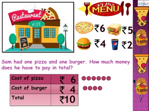Sam had one pizza and one burger. How much money does he have to pay in total? Cost of pizza Cost of burger Total