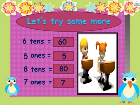 6 tens = 60 5 ones = 5 8 tens = 80 7 ones = 7