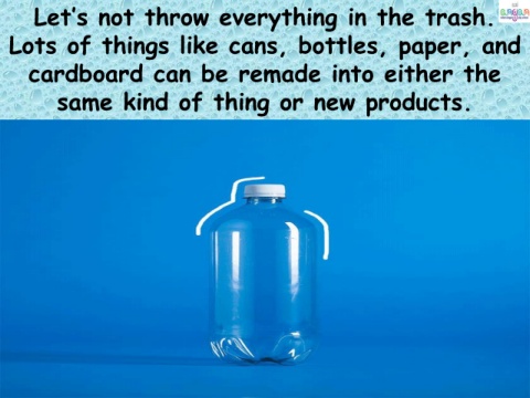 Let’s not throw everything in the trash. Lots of things like cans, bottles, paper, and cardboard can be remade into either the same kind of thing or new products.