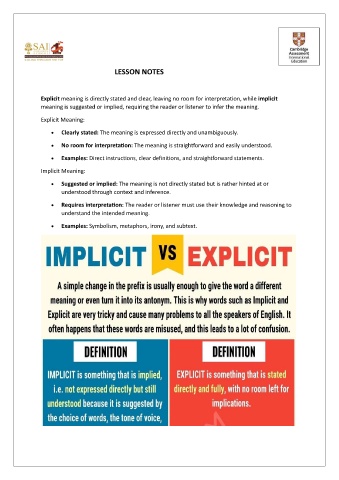 Explicit meaning is directly stated and clear, leaving no room for interpreta on, while implicit