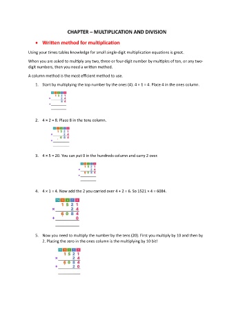 4. 4 × 1 = 4. Now add the 2 you carried over 4 + 2 = 6. So 1521 × 4 = 6084.
