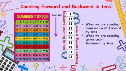 Counting Forward and Backward in tens Column 1 11 21 • When we are counting 31 down we count forward 41 by tens. 51 • When we are counting up we count 61 Forward counting in tens backward by tens. 71 81 Backward counting in tens 91