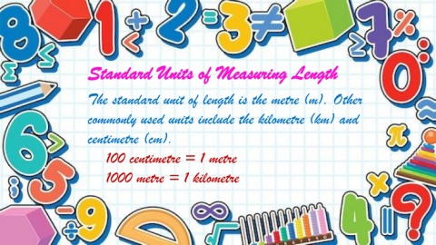 Standard Units of Measuring Length The standard unit of length is the metre (m). Other commonly used units include the kilometre (km) and centimetre (cm). 100 centimetre = 1 metre 1000 metre = 1 kilometre