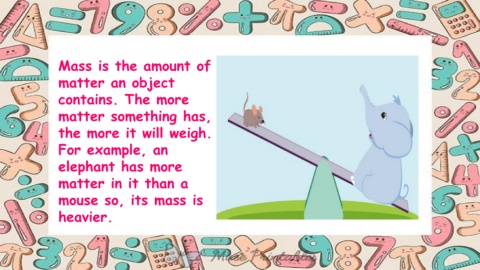 Mass is the amount of matter an object contains. The more matter something has, the more it will weigh. For example, an elephant has more matter in it than a mouse so, its mass is heavier.
