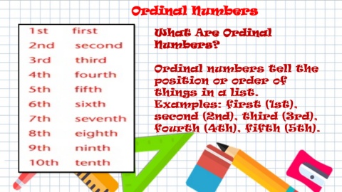 Ordinal Numbers What Are Ordinal Numbers? Ordinal numbers tell the position or order of things in a list. Examples: first (1st), second (2nd), third (3rd), fourth (4th), fifth (5th).