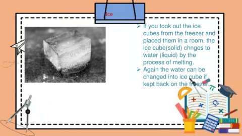 Ice ➢ If you took out the ice cubes from the freezer and placed them in a room, the ice cube(solid) chnges to water (liquid) by the process of melting. ➢ Again the water can be changed into ice cube if kept back on the freezer.