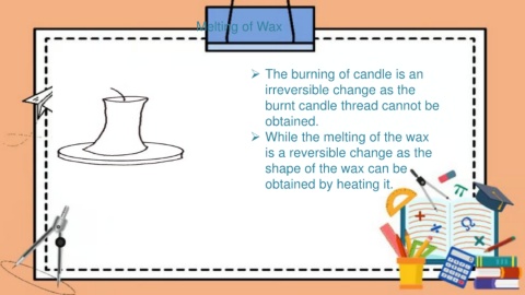 Melting of Wax ➢ The burning of candle is an irreversible change as the burnt candle thread cannot be obtained. ➢ While the melting of the wax is a reversible change as the shape of the wax can be obtained by heating it.