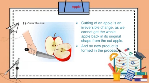 Apple ➢ Cutting of an apple is an irreversible change, as we cannot get the whole apple back in its original shape from the cut apple. ➢ And no new product is formed in the process.