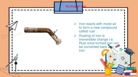 Rusting of Iron ➢ Iron reacts with moist air to form a new compound called rust . ➢ Rusting of iron is irreversible change i.e. Rust once formed can not be converted back into iron.