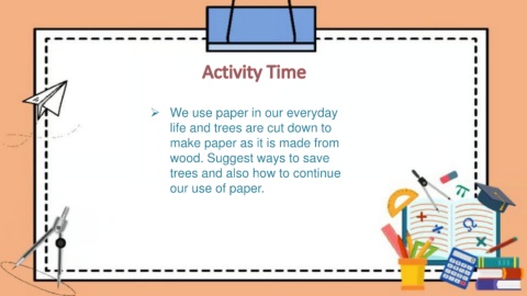 Activity Time ➢ We use paper in our everyday life and trees are cut down to make paper as it is made from wood. Suggest ways to save trees and also how to continue our use of paper.
