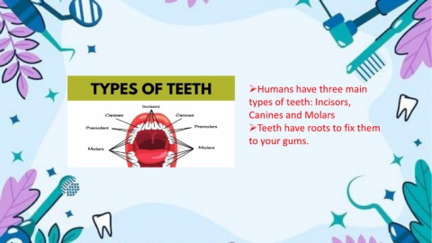 Humans have three main types of teeth: Incisors, Canines and Molars Teeth have roots to fix them to your gums.