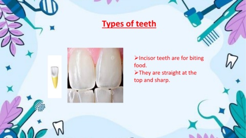 Types of teeth Incisor teeth are for biting food. They are straight at the top and sharp.