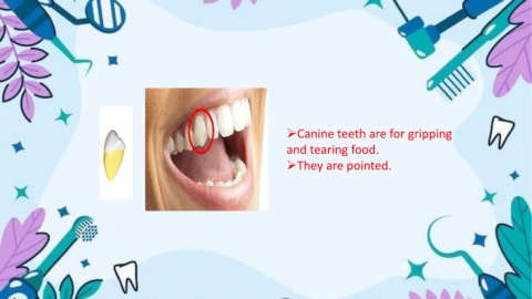 Canine teeth are for gripping and tearing food. They are pointed.