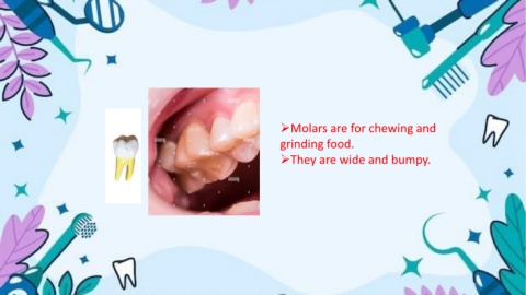 Molars are for chewing and grinding food. They are wide and bumpy.