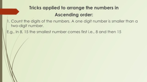 Tricks applied to arrange the numbers in Ascending order: 1. Count the digits of the numbers. A one digit number is smaller than a two-digit number. E.g., In 8, 15 the smallest number comes first i.e., 8 and then 15