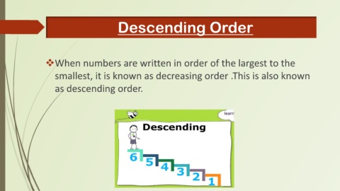 Descending Order ❖When numbers are written in order of the largest to the smallest, it is known as decreasing order .This is also known as descending order.