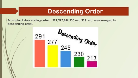 Descending Order Example of descending order :- 291,277,245,230 and 213 etc. are arranged in descending order.