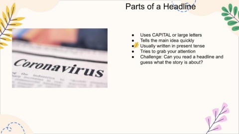Parts of a Headline ● Uses CAPITAL or large letters ● Tells the main idea quickly ● Usually written in present tense ● Tries to grab your attention ● Challenge: Can you read a headline and guess what the story is about?