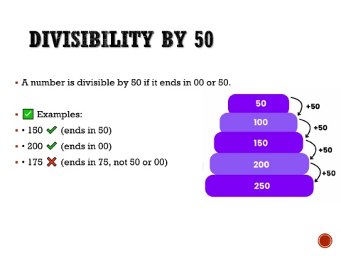DIVISIBILITY BY 50 ▪ A number is divisible by 50 if it ends in 00 or 50. ▪ Examples: ▪ • 150 (ends in 50) ▪ • 200 (ends in 00) ▪ • 175 (ends in 75, not 50 or 00)