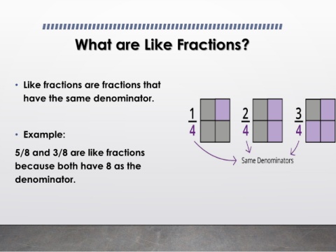 What are Like Fractions? • Like fractions are fractions that have the same denominator. • Example: 5/8 and 3/8 are like fractions because both have 8 as the denominator.