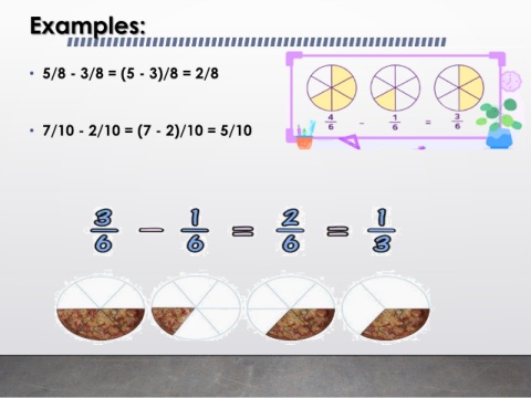 Examples: • 5/8 - 3/8 = (5 - 3)/8 = 2/8 • 7/10 - 2/10 = (7 - 2)/10 = 5/10