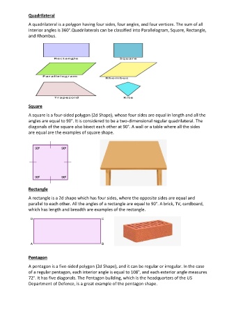interior angles is 360°.Quadrilaterals can be classified into Parallelogram, Square, Rectangle,