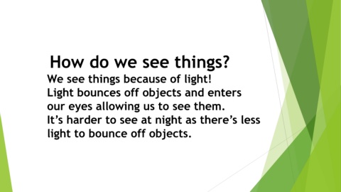 How do we see things? We see things because of light! Light bounces off objects and enters our eyes allowing us to see them. It’s harder to see at night as there’s less light to bounce off objects.