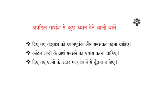M - O ide gae gad\yaaSa kao QyaanapUvak Aar samaJakr pZ,naa caaihe. o kizna Sabdao ko Aqa- samaJana ka p`yaasa krnaa caaihe. M ide gae p`SnaaM ko ]%tr gad\yaaMSa maoM sao Z,ÐUZ,naa caaihe. o