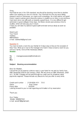 New Year. Write an e-mail to the manager of a hotel in Goa to book a room for you
