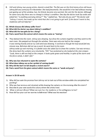 E. SUE and Johnsy, two young artists, shared a small flat. The flat was on the third storey of an old house.