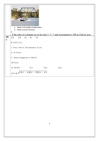 1. What is the length of equal sides. 2. What is herons formula 3. AN 1.d 2.b 3.c 4.c 5.b S 2 6. 21√11 cm , 2 7. Area = 84 cm , the altitude is 12 cm. 2 8. 15.16 cm . 2 9. Area of trapezium is 1644 m 10.Proof, 2 11. 65.5m 12.a 13.b 14.a 15.8 ii) 3