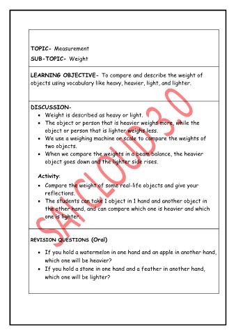 LEARNING OBJECTIVE- To compare and describe the weight of