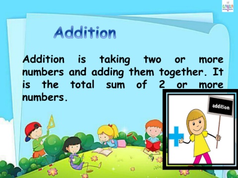 Addition is taking two or more numbers and adding them together. It is the total sum of 2 or more numbers.