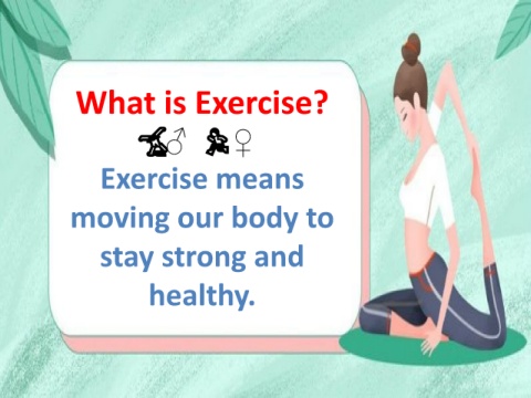 is t a Ex e? cis er What is Exercise? Wh ᒴ ♂ ᴱ ♀ Exercise means Ex er cis e mean s moving our body to y mo o vin t g our bod stay strong and h ealt h y . healthy.