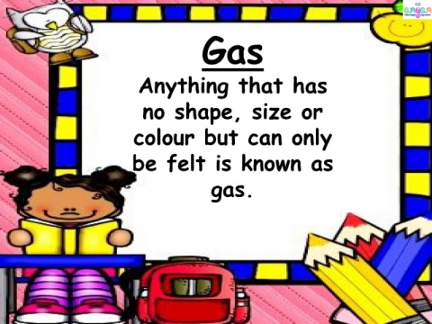 Gas Anything that has no shape, size or colour but can only be felt is known as gas.