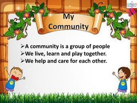 A c om munity is a g r oup of peopl e A community is a group of people We live, learn and play together. W e help and c ar e f or ea ch other . We help and care for each other.