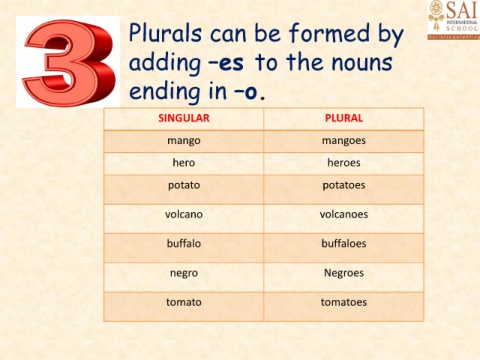Plurals can be formed by adding –es to the nouns ending in –o. SINGULAR PLURAL mango mangoes hero heroes potato potatoes volcano volcanoes buffalo buffaloes negro Negroes tomato tomatoes