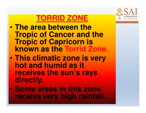 TORRID ZONE • The area between the Tropic of Cancer and the Tropic of Capricorn is known as the Torrid Zone. • This climatic zone is very hot and humid as it receives the sun’s rays directly. • Some areas in this zone receive very high rainfall.