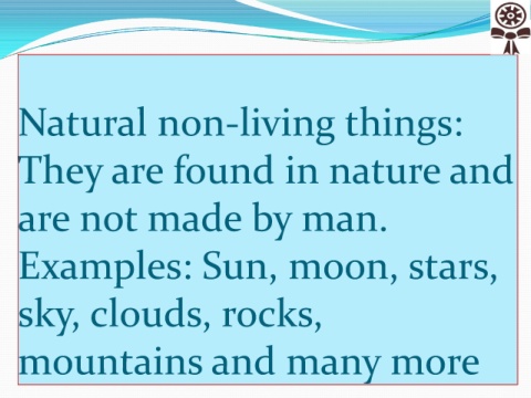 Natural non-living things: They are found in nature and are not made by man. Examples: Sun, moon, stars, sky, clouds, rocks, mountains and many more