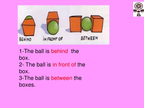 1-The ball is behind the box. 2- The ball is in front of the box. 3-The ball is between the boxes.