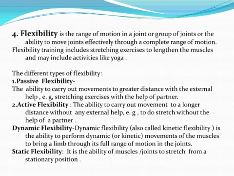 4. Flexibility is the range of motion in a joint or group of joints or the