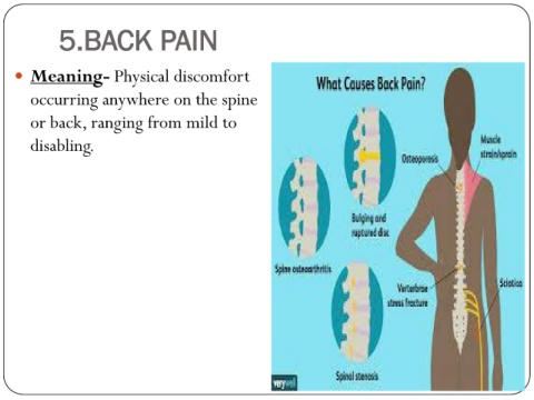 5.BACK PAIN Meaning- Physical discomfort occurring anywhere on the spine or back, ranging from mild to disabling.