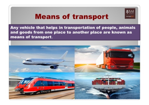 Means of transport Any vehicle that helps in transportation of people, animals and goods from one place to another place are known as me a n s o f t r a n sp o r t . means of transport.