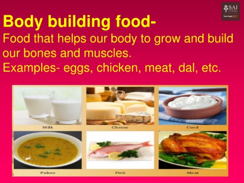 Body building food- Food that helps our body to grow and build our bones and muscles. Examples- eggs, chicken, meat, dal, etc.