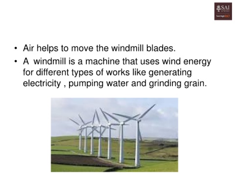 • Air helps to move the windmill blades. • A windmill is a machine that uses wind energy for different types of works like generating electricity , pumping water and grinding grain.