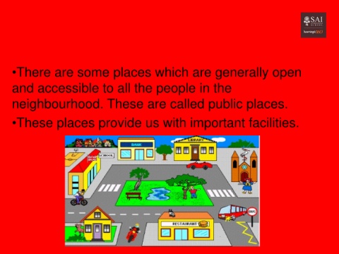 •There are some places which are generally open and accessible to all the people in the neighbourhood. These are called public places. •These places provide us with important facilities.