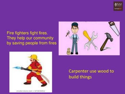 Fire fighters fight fires. They help our community by saving people from fires Carpenter use wood to build things