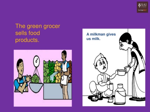 The green grocer sells food A milkman gives products. us milk.