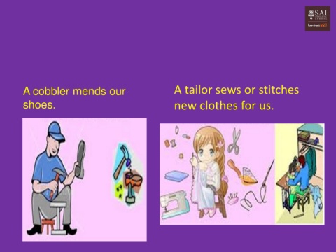 A cobbler mends our A tailor sews or stitches shoes. new clothes for us.