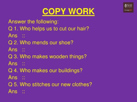 COPY WORK Answer the following: Q 1. Who helps us to cut our hair? Ans :: Q 2. Who mends our shoe? Ans :: Q 3. Who makes wooden things? Ans :: Q 4. Who makes our buildings? Ans :: Q 5. Who stitches our new clothes? Ans ::